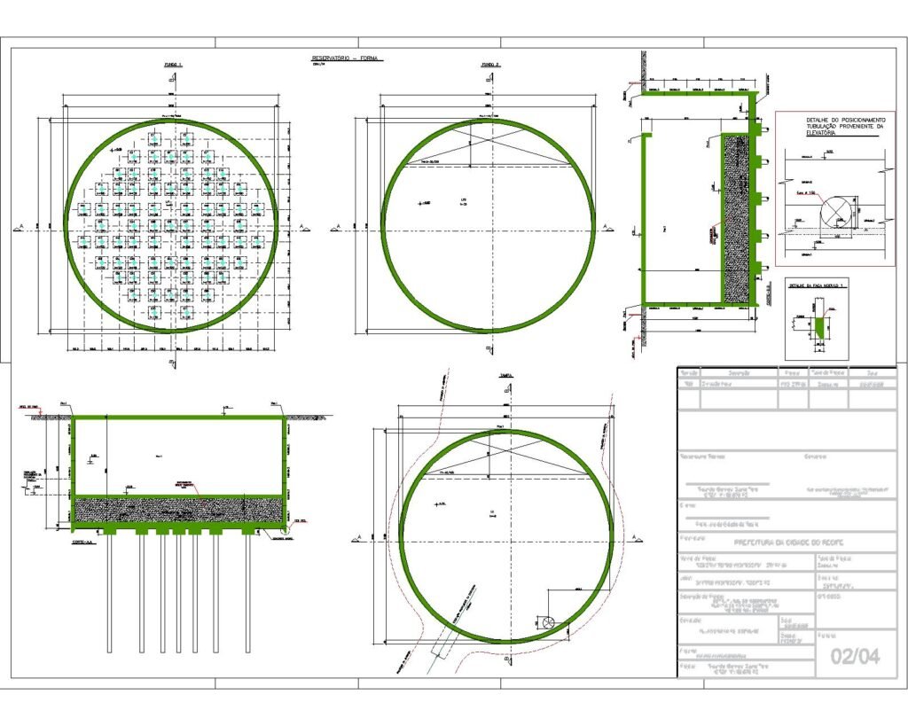 Reservatório circular enterrado com capacidade de 3.100 metros cúbicos. Devido ao fato de, por sua função, a estrutura permanecer vazia, a sua laje de fundo é solidarizada a um conjunto de 71 estacas tipo raiz, com comprimento de 30 metros, que têm a função principal de evitar a flutuação da estrutura em uma eventual elevação do lençol freático, sem que haja água em seu interior. As paredes e a laje de tampa têm espessura de 40 centímetros, e a laje de fundo, 60 centímetros, sendo dotada de capitéis na região das estacas.